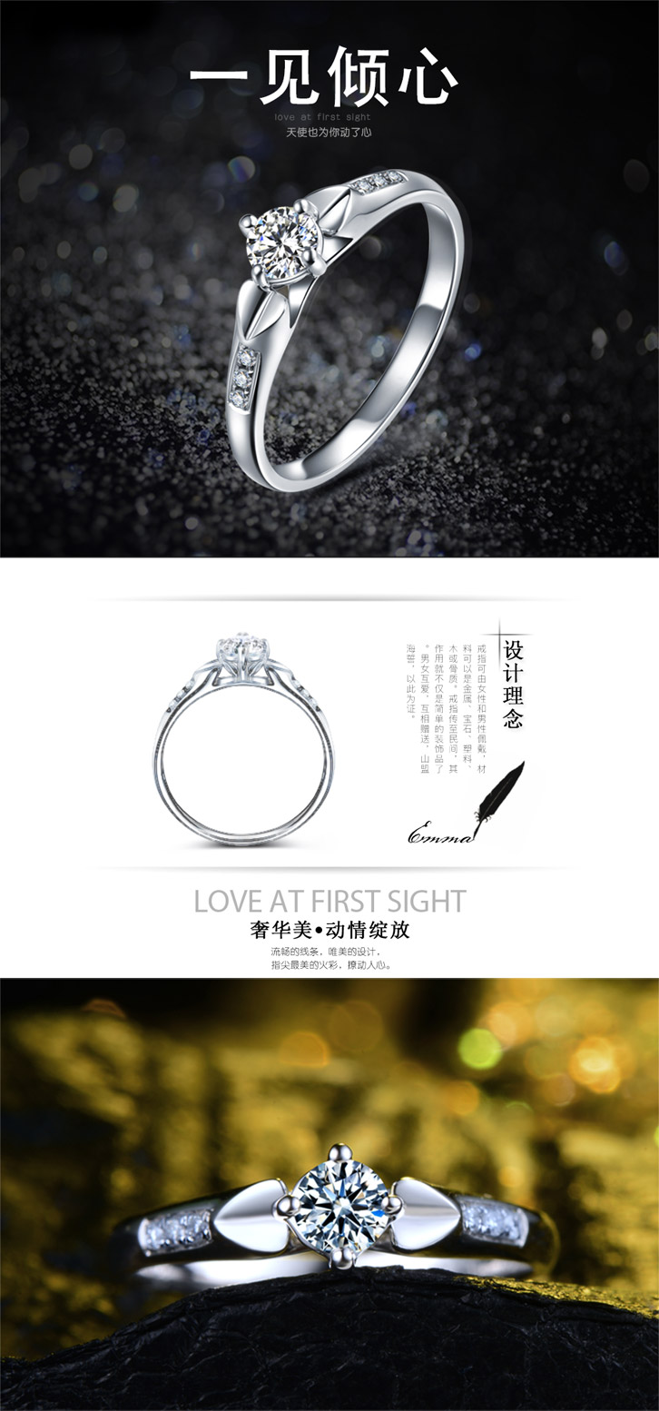 戒指是一种戴在手指上的装饰珠宝。戒指可由女性和男性佩戴,材料可以是金属、宝石、塑料、木或骨质。戒指传至民间,其作用就不仅是简单的装饰品了。男女互爱,互相赠送,山盟海誓,以此为证。钻石希腊文ademas代表不可征服之意。是云云宝石中较坚硬的一种。古罗马人一直认为它代表生命和永恒,到了15世纪更被认定为代表坚贞不渝的结婚象征意义。